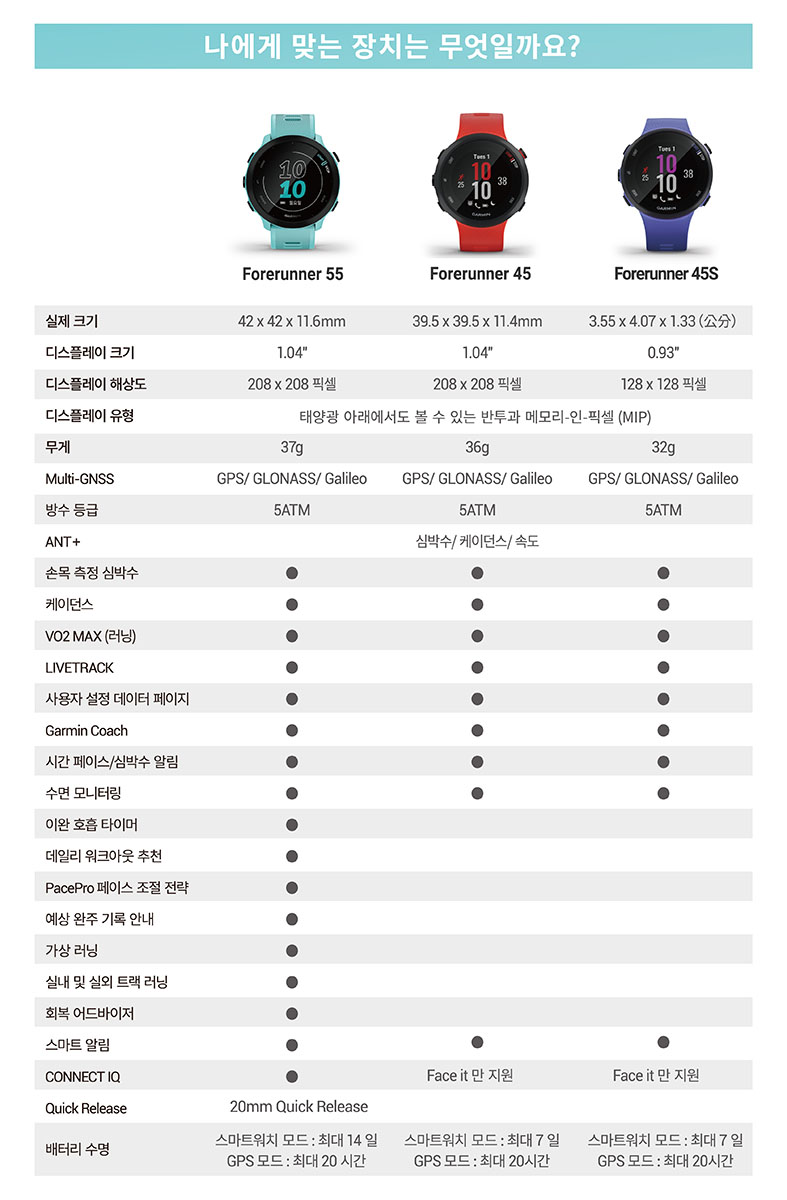 렌즈재질 : 강화유리/ 베젤 재질: 실리/ 디스플레이 유형 : MIP/ 방수등급 : 5ATM / 메모리 : 200시간의 활동 데이터 /디스플레이 해상도 : 208 x 208 픽셀/스마트모드 : 최대 14일/GPS 모드: 최대 20시간